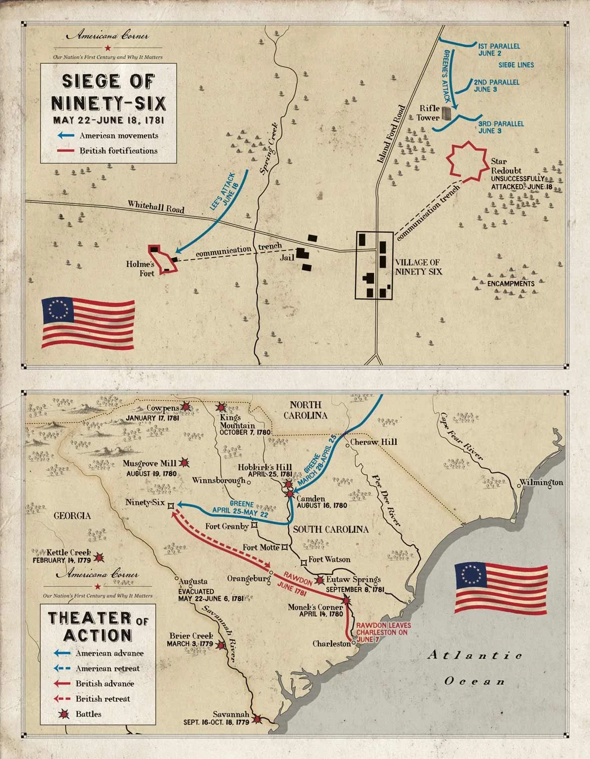 In the spring of 1781, American forces under General Nathanael Greene rolled up the British garrisons in the interior of the Carolinas one by one. The last British holdout was the fortified town of Ninety Six, in the foothills of western South Carolina. Greene arrived on the scene with 1,000 men and commenced the siege of Ninety Six on May 22.